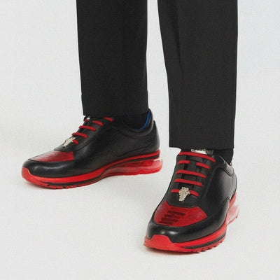 Step into luxury street style with the Belvedere Flash Men’s Sneakers, handcrafted from a premium blend of genuine exotic ostrich leather and smooth calfskin. These bold black and red designer sneakers fuse high-end Italian-inspired fashion with everyday comfort, giving you a statement look that turns heads in any setting.