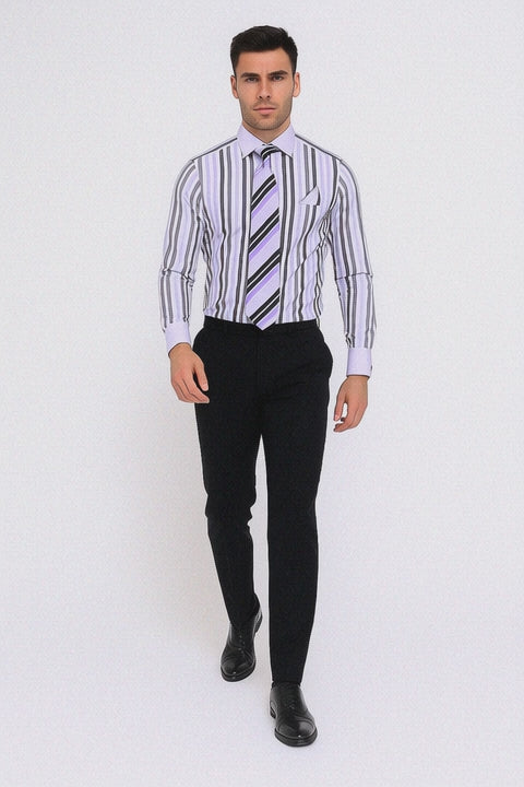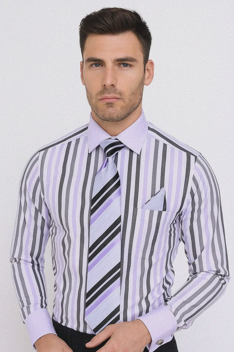 Upgrade your formalwear with ease and confidence. The Classic Fit Black Striped French Cuff Dress Shirt with Tie & Hanky is the ultimate all-in-one solution for men who appreciate tailored style with thoughtful details.