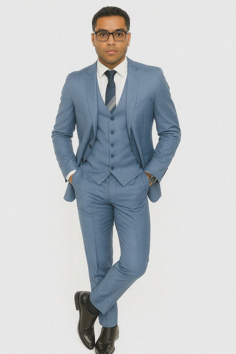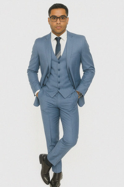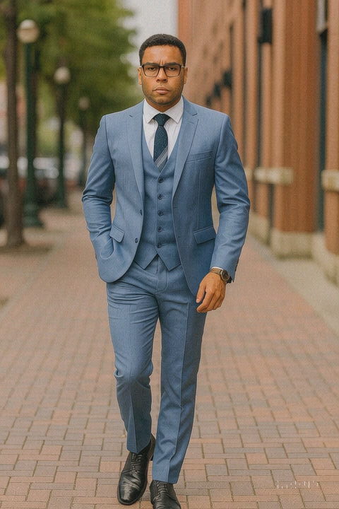 This suit delivers a refined look with its sleek design and soft dusty blue tone, making it a standout choice for weddings. Pair it with a crisp white shirt and tie for a polished finish.