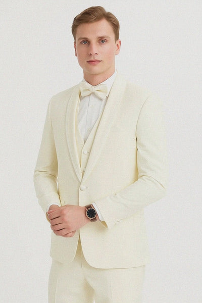Step into timeless sophistication with the Men’s One Button Satin Trim Shawl Tuxedo in Ivory Wool, a masterfully tailored ensemble designed for men who value classic style and refined elegance. This tuxedo embodies the essence of formal luxury, crafted from premium ivory wool that offers both comfort and breathability while exuding effortless charm.