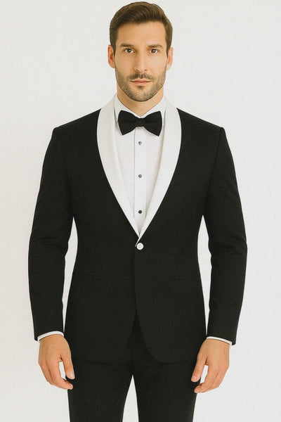 The sleek black body paired with the white shawl lapel creates a striking contrast that exudes luxury and confidence. The one-button closure design offers a clean, polished silhouette, ensuring a flattering fit that enhances the masculine form. The shawl collar, finished in a smooth satin white tone, adds a distinctive touch of sophistication — perfectly complementing the crisp white dress shirt and black bow tie for an effortlessly elegant look.
