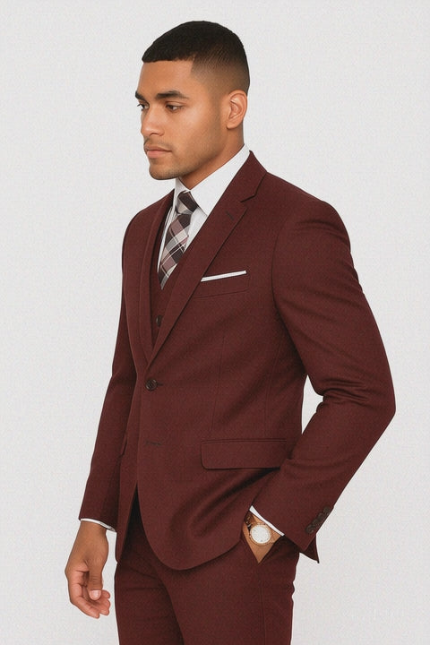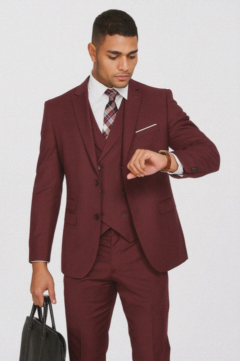 - Make a bold and timeless fashion statement with this Men’s 2-Button Slim Fit Wool Suit with Double Breasted Vest in Burgundy—a masterful blend of classic tailoring and contemporary style. Crafted from premium 100% Super 150's wool, this suit delivers sophistication, comfort, and durability in one refined ensemble, making it the perfect choice for modern men who dress to impress.