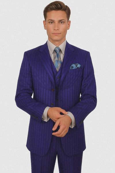Sharp, Stylish Design: 4-button suit with wide tonal shiny pinstripe, plus complimentary vest.