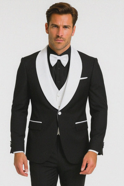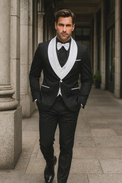 Expertly tailored with a one-button single-breasted front, this jacket showcases a luxurious white shawl lapel that adds definition and flair to its sleek black body. The double-breasted vest offers depth and layering versatility, allowing you to dress it up or down with ease.