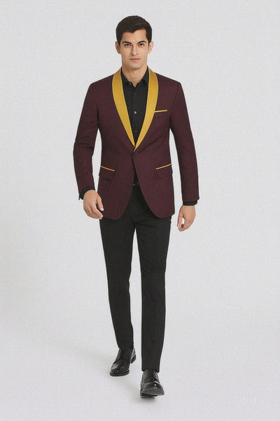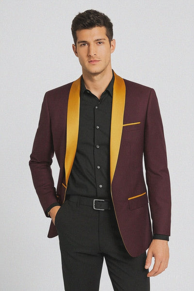 The Mens Blazer Burgundy ~ Gold Tuxedo Dinner Jacket is the ultimate symbol of luxury, elegance, and confidence. Crafted for men who are not afraid to make a bold statement, this jacket combines the richness of burgundy with the sophistication of gold detailing to create a masterpiece of formalwear. It is not just a jacket; it is a celebration of style, personality, and refinement that ensures you leave an unforgettable impression at every event. Whether it is a wedding, prom, gala, or any black-tie affair, this tuxedo dinner jacket is designed to command attention and admiration.