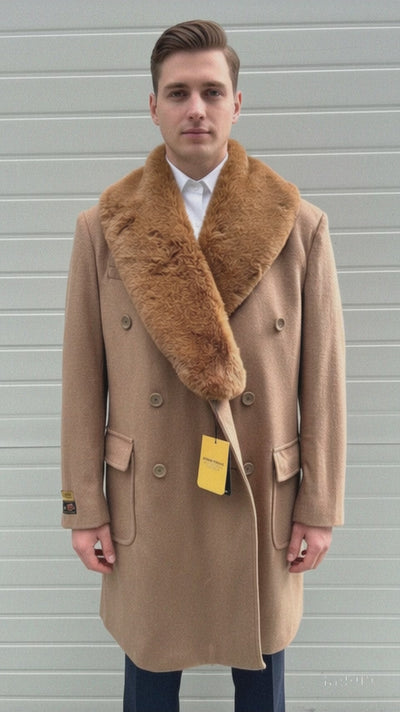 The Men’s Camel Color Wool Peacoat is a statement of timeless elegance and refined style. Tailored in a single-breasted, three-button design, it offers a sleek and classic silhouette perfect for formal or casual wear. The luxurious fur collar adds a touch of sophistication and warmth, elevating its premium look. Featuring a ticket pocket and two flap front pockets, it combines function with fashion for everyday practicality. Crafted from high-quality wool fabric, this full-length overcoat provides excellent insulation against the cold. The rich camel color enhances its classy appeal, making it a versatile addition to any wardrobe. Designed for comfort and durability, it’s a must-have winter essential for the modern gentleman.