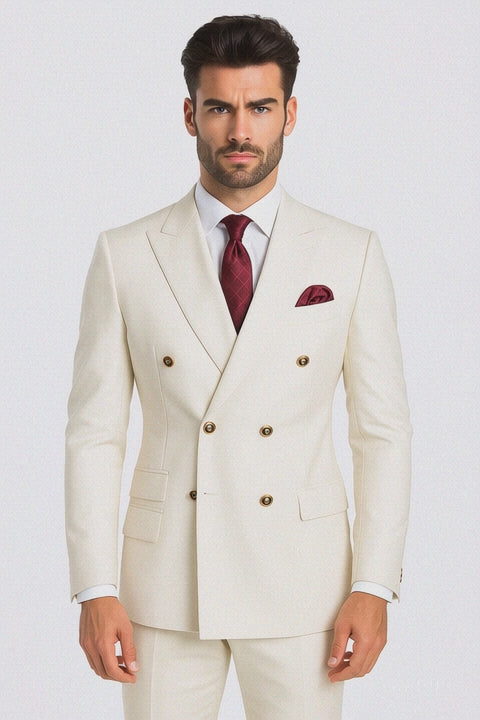 Mens Designer Modern Fit Double Breasted Wool Suit with Gold Buttons in White