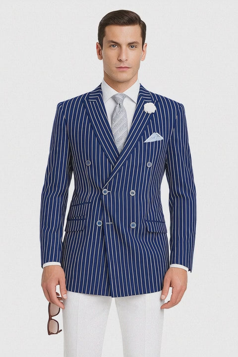 Step into timeless style and commanding confidence with the Men’s Double-Breasted Pinstripe Blazer in Navy. This is not just a jacket it’s a bold sartorial statement. Featuring a structured double-breasted cut and traditional vertical pinstripes, this sportcoat is a staple for men who want to project power, refinement, and vintage-inspired flair with a modern edge.