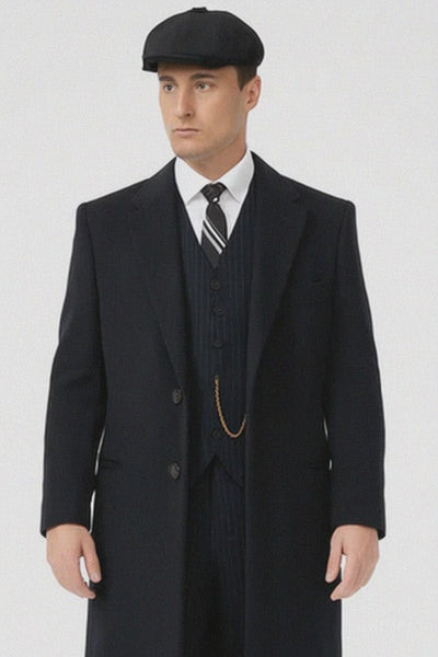 The Peaky Blinders Outfit includes a black herringbone long overcoat, matching vintage trousers, a classic vest, and the iconic Peaky Blinder actor cap, completing an authentic recreation of the legendary gangster look. Each piece is designed with meticulous detail — from the overcoat’s sharp lapels and thick woven texture to the cap’s traditional flat design — evoking the grit and glamour of 1920s English fashion.