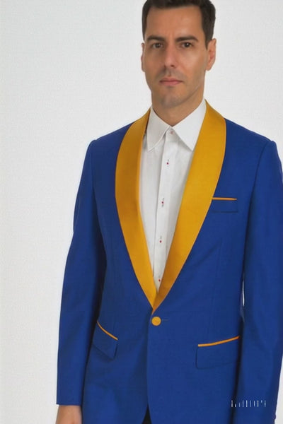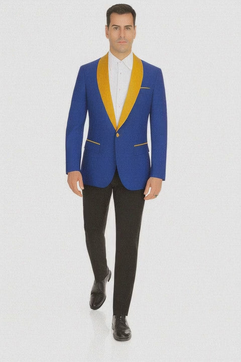 - Mens One Button Contrast Shawl Collar Dinner Jacket Royal Blue & Gold