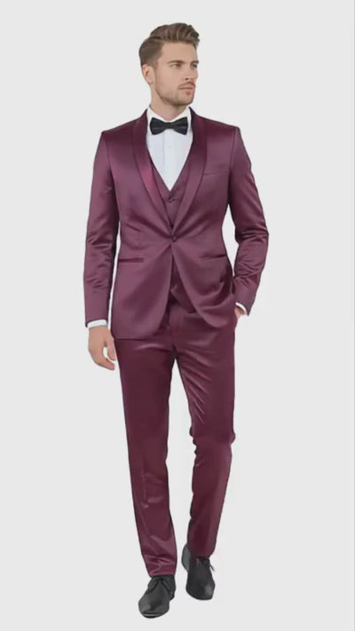 Make a powerful statement with this burgundy slim fit tuxedo, designed for men who appreciate bold elegance and modern tailoring. Featuring a sleek satin shawl lapel, this tuxedo delivers a refined look ideal for weddings, proms, galas, and black-tie events.