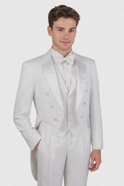 Exude timeless elegance in this Men’s White Tuxedo with Tails, a distinguished 3-piece ensemble designed for the most formal occasions. Featuring a pleated sateen-trimmed jacket with split tails, this tuxedo embodies sophistication and grace — perfect for weddings, galas, or evening performances.