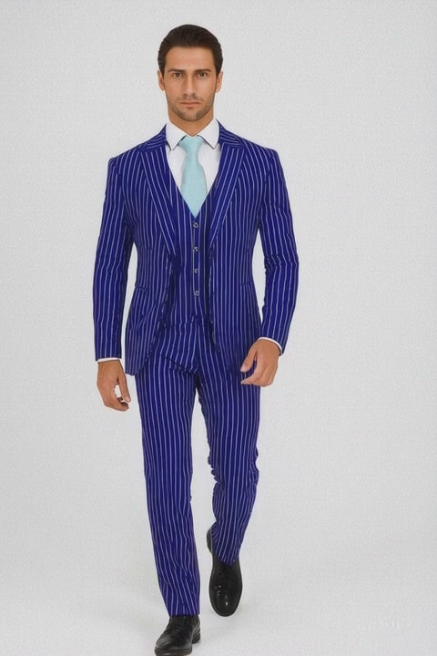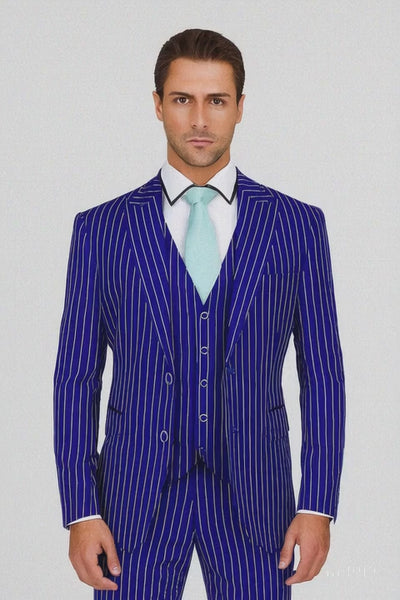 Step back into the Golden Age of style with this vested gangster pinstripe suit, inspired by the roaring 1920s. Featuring a three-piece design with a matching vest, bold pinstripes, and a sharp tailored cut, this suit exudes vintage charm with a modern edge. The deep blue color brings a contemporary twist, making it a timeless yet statement-making outfit for themed events, formal occasions, and stylish evenings.