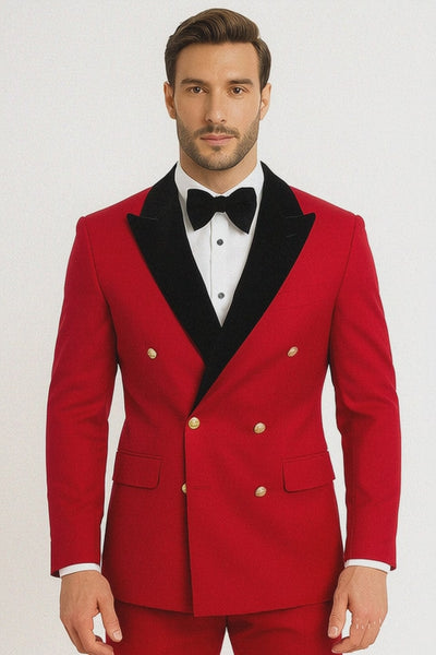 Make your grand entrance unforgettable with this Red Double Breasted Tuxedo with Velvet Peak Lapel. Perfect for weddings, proms, award ceremonies, or red-carpet events — this is the tuxedo that ensures all eyes are on you.