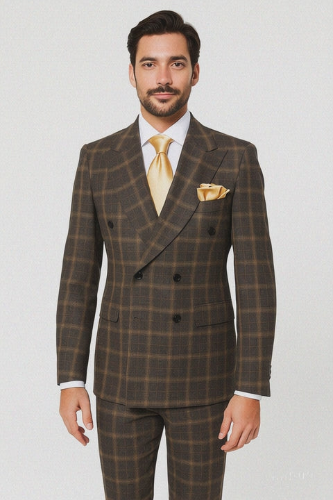Rossiman Classic Wool Suit – Brown Windowpane Plaid Double-Breasted Formalwear