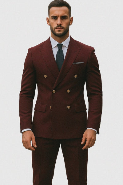 Make a bold and sophisticated statement with this Burgundy Slim Fit Double-Breasted Suit, featuring luxurious gold buttons that elevate your look with refined detail. Crafted from premium designer wool, this suit combines timeless tailoring with a modern, slim silhouette — perfect for upscale events and formal occasions.