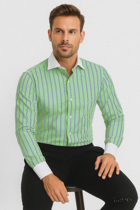 Make a bold yet refined statement with the Striped Pattern Matching White Collar & Cuffs Green Cotton Gingham Dress Shirt, designed for the modern man who enjoys mixing tradition with a touch of personality. Crafted from breathable cotton and detailed with refined accents, this shirt ensures that you stand out whether at work, formal gatherings, or stylish evening occasions. Paired with a complimentary bowtie, it offers complete sophistication right out of the box.