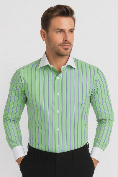 Striped Pattern Matching White Collar & Cuffs Green Cotton Men's Dress Gingham Shirt – Checker Pattern – French Cuff – White Collared + Free Bowtie