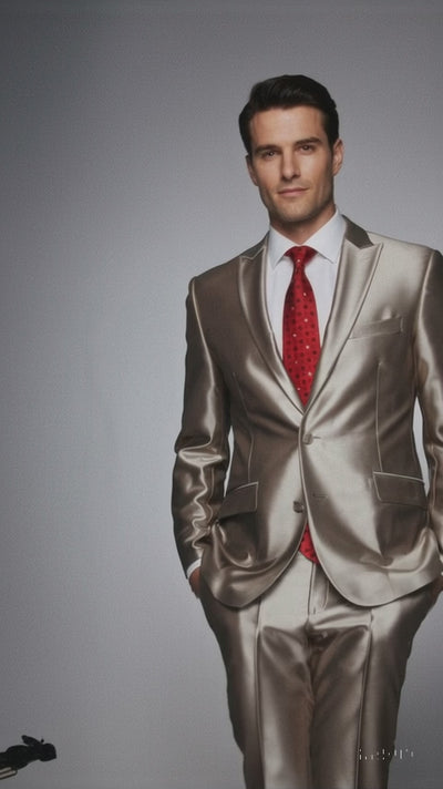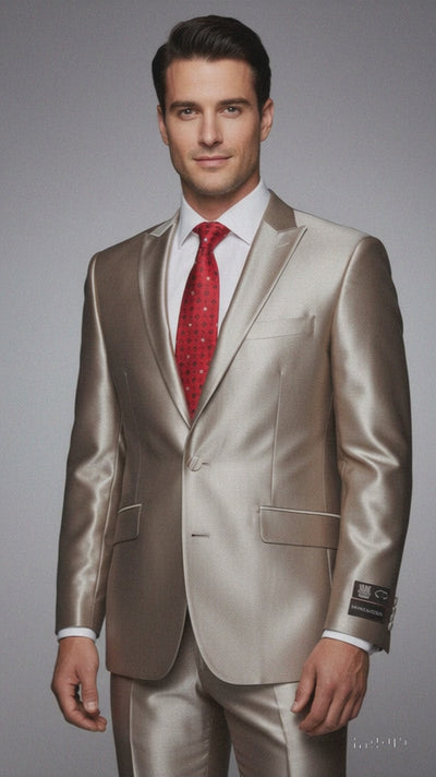 The Men’s Shiny Sharkskin Tan-Champagne Suit delivers a bold and sophisticated statement for any formal occasion. Crafted from luxurious shiny sharkskin fabric, it reflects light beautifully, giving a subtle yet eye-catching sheen. The single-breasted jacket features a notch collar and a two-button closure, combining modern style with timeless elegance. Designed with two besom front pockets and flat front slacks, it maintains a clean, tailored silhouette. The beige–taupe tone adds a refined flair that complements both daytime and evening events. Perfect for weddings, proms, business meetings, and black-tie affairs, this suit brings an unmistakable touch of class and confidence to your wardrobe.